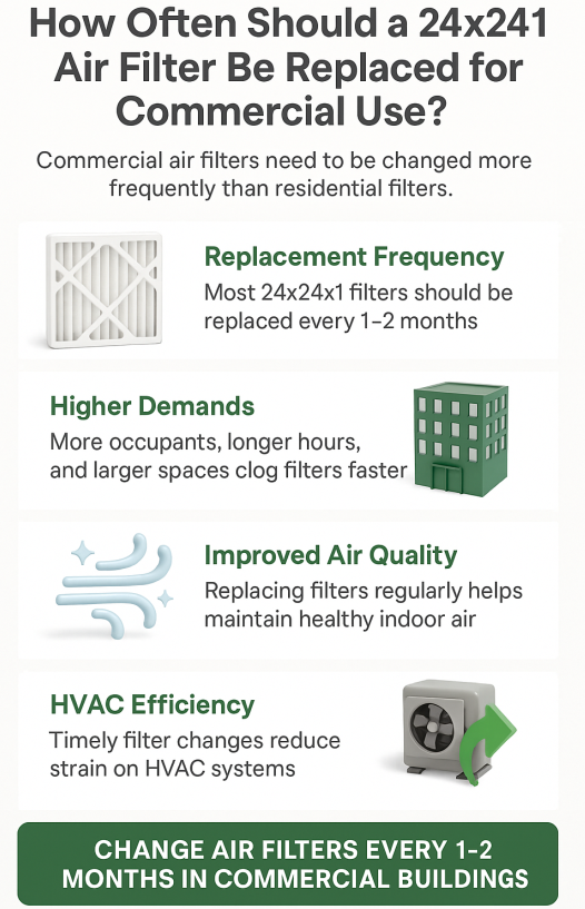 “After supplying millions of 24x24x1 filters to commercial facilities nationwide, we’ve seen that sticking to a 30–60 day replacement cycle isn’t just about air quality—it’s about protecting your HVAC investment. Facilities that stay on schedule consistently report lower energy bills, fewer system breakdowns, and healthier environments for employees and customers alike.”